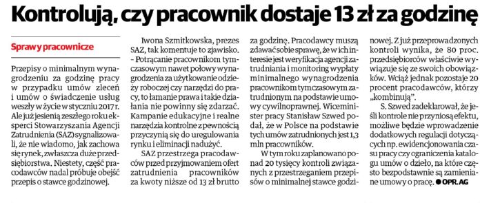 Gazety szeroko opisują poparcie jakiego udzielił SAZ dla akcji "13 zł... i nie kombinuj" organizowanej przez NSZZ Solidarność i Państwową Inspekcję Pracy.